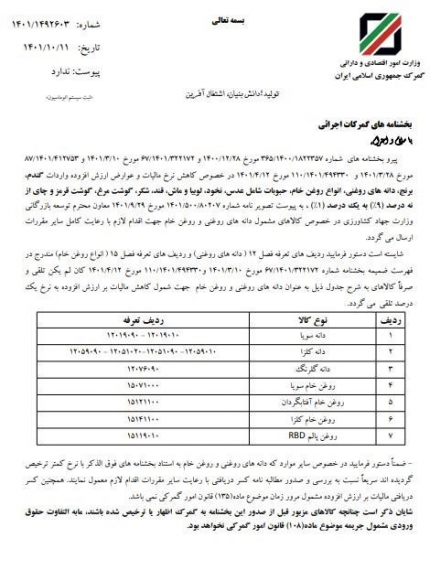 در این نامه که از سوی معاون محترم توسعه بازرگانی وزارت جهاد کشاورزی صادر شده آمده آمده است: درخصوص سایر موارد که دانههای روغنی و روغن خام به استناد بخشنامههای فوقالذکر با نرخ کمتر ترخیص گردیدهاند سریعاً نسبت به بررسی و صدور مطالبه نامه کسر دریافتی با رعایت سایر مقررات اقدام لازم معمول نمایند. همچنین کسر دریافتی مالیات برارزش افزوده مشمول مرور زمان موضوع ماده (١٣٥) قانون امور گمرکی نمیباشد.