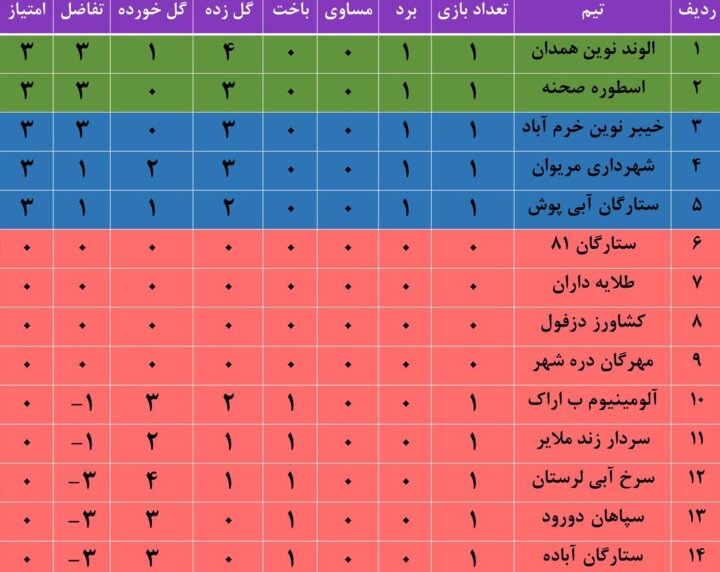 الوند نوین همدان به لطف تفاضل گل بهتر موفق شد در همین هفته نخست صدر جدول را به نام خود ثبت کند، تیمی که شاکله آن را بازیکنان مستعد و جوان بومی تشکیل می‌دهند.